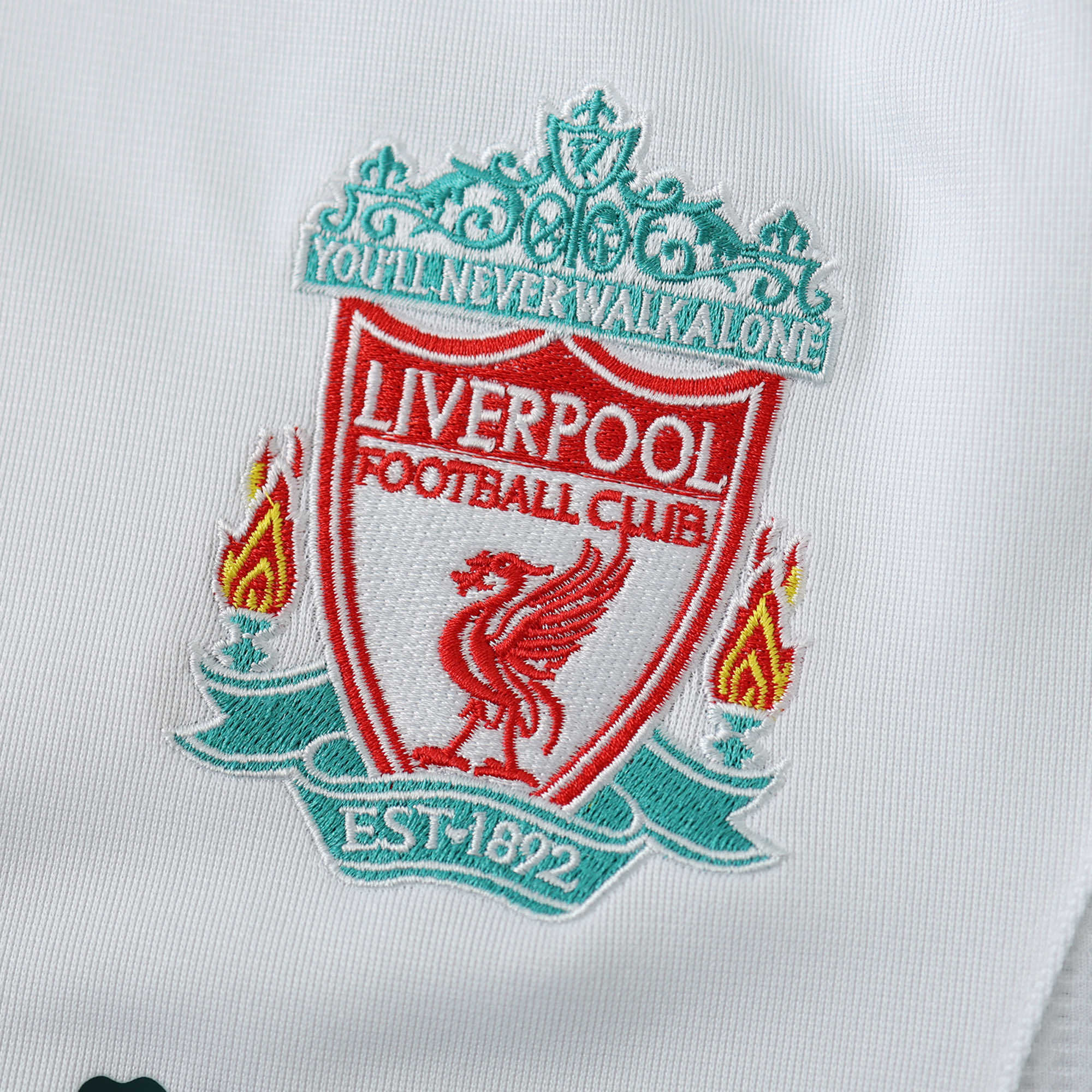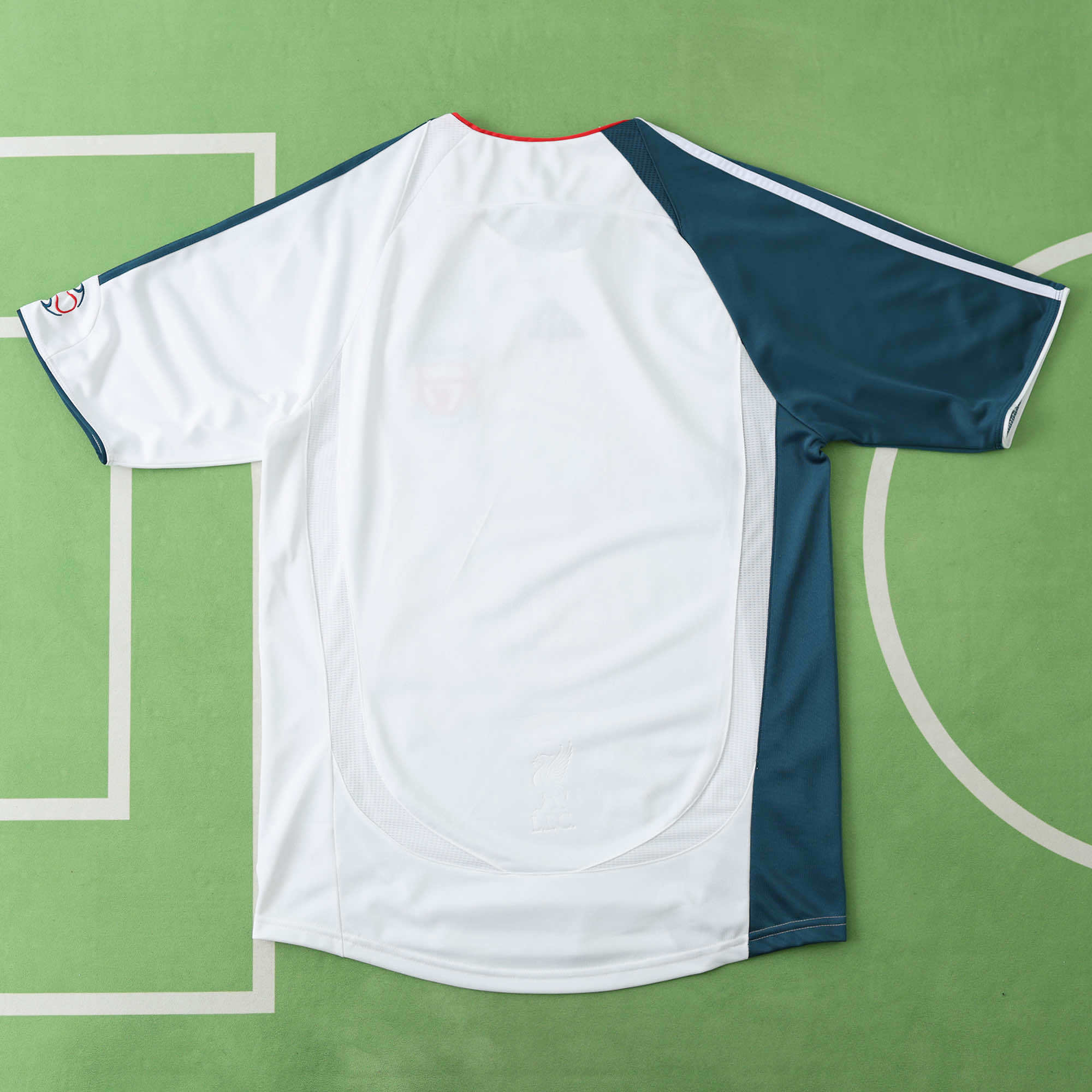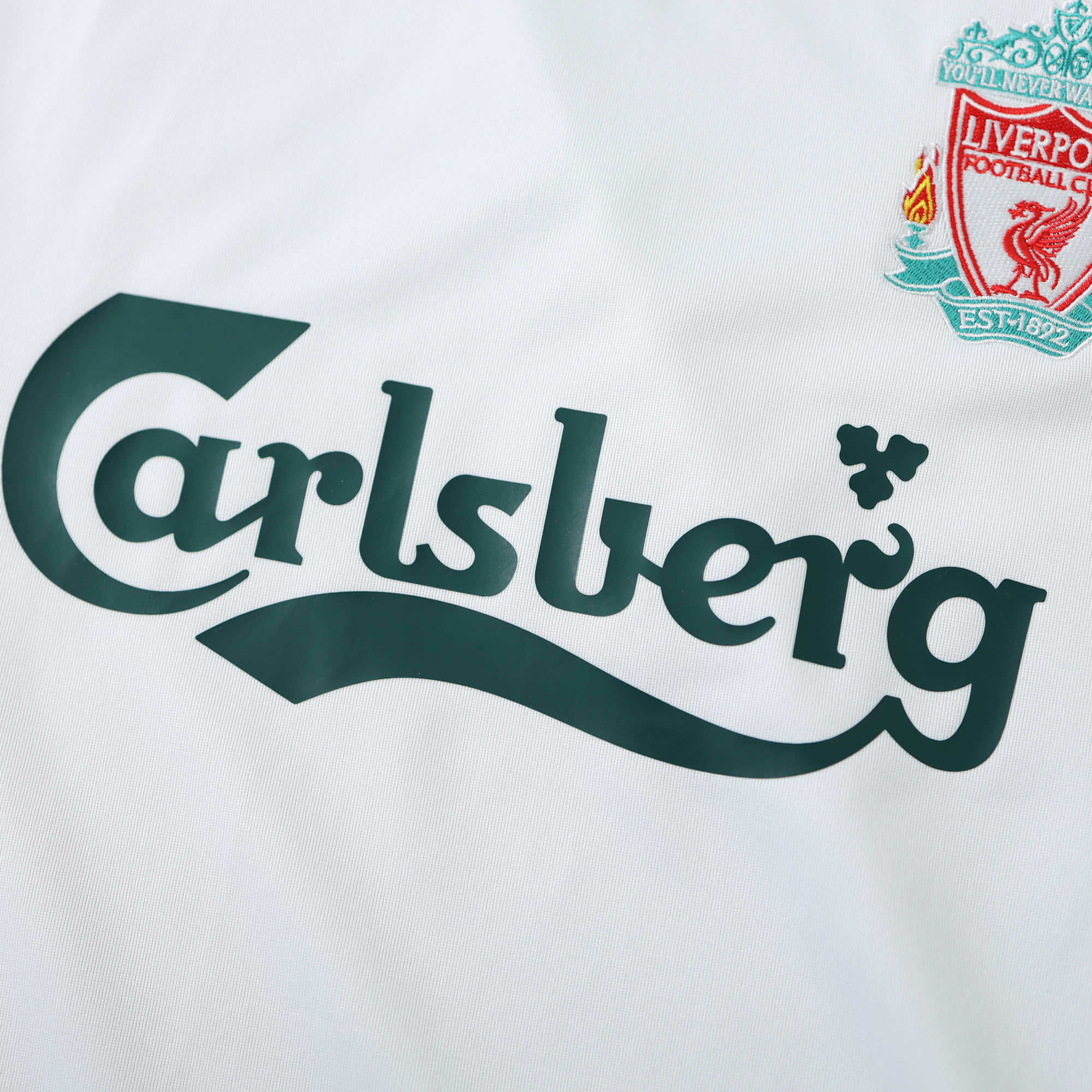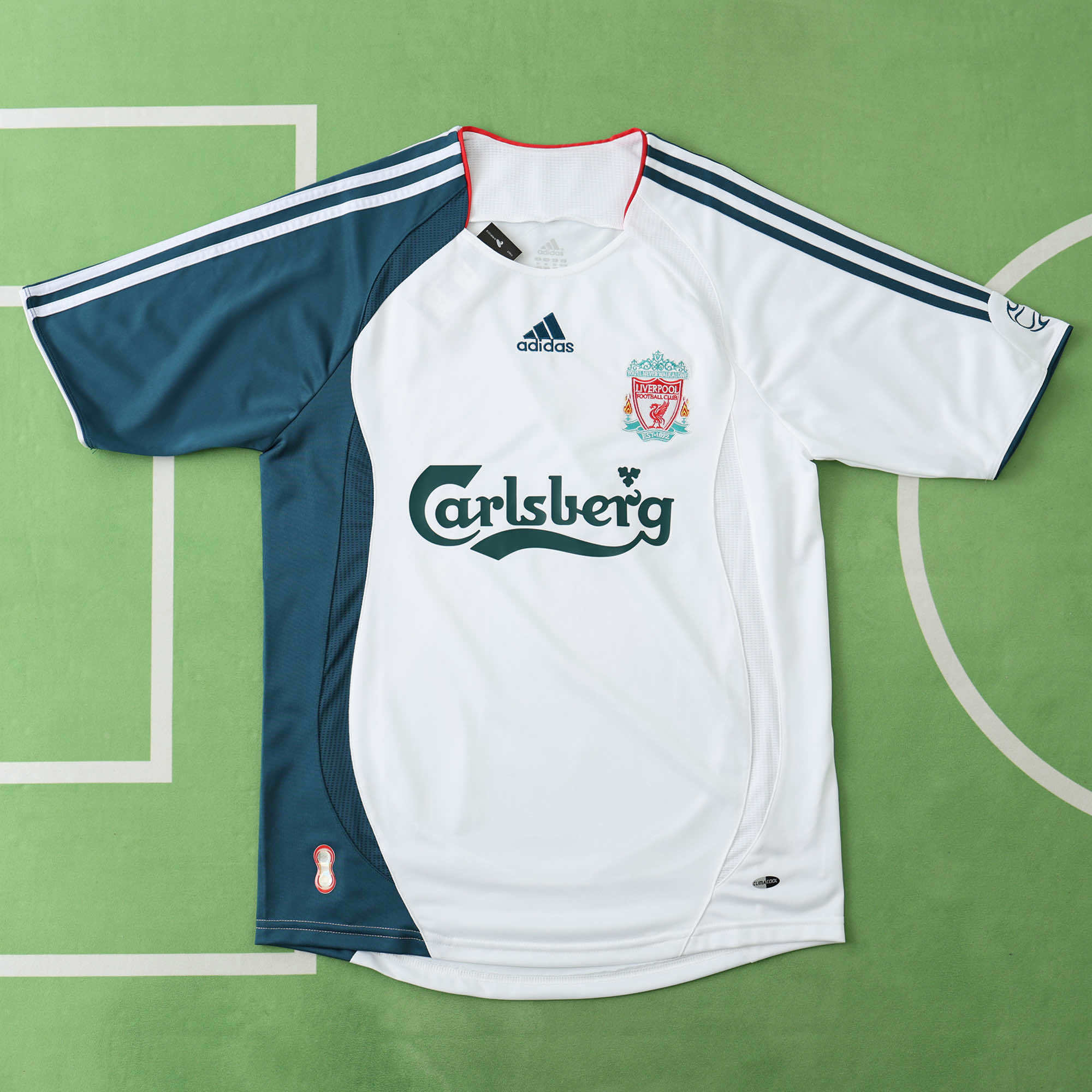 The 2006/07 Liverpool third shirt, made by Adidas, reflects an experimental and bold design for the time. Rather than the usual red, it features a predominantly white base with a contrasting teal-green panel down one side — a distinctive asymmetry that makes the shirt instantly recognisable. The sponsor logo (Carlsberg) is printed in green, matching the Adidas branding and the sleeve stripes, while the club crest is embroidered in its classic colours