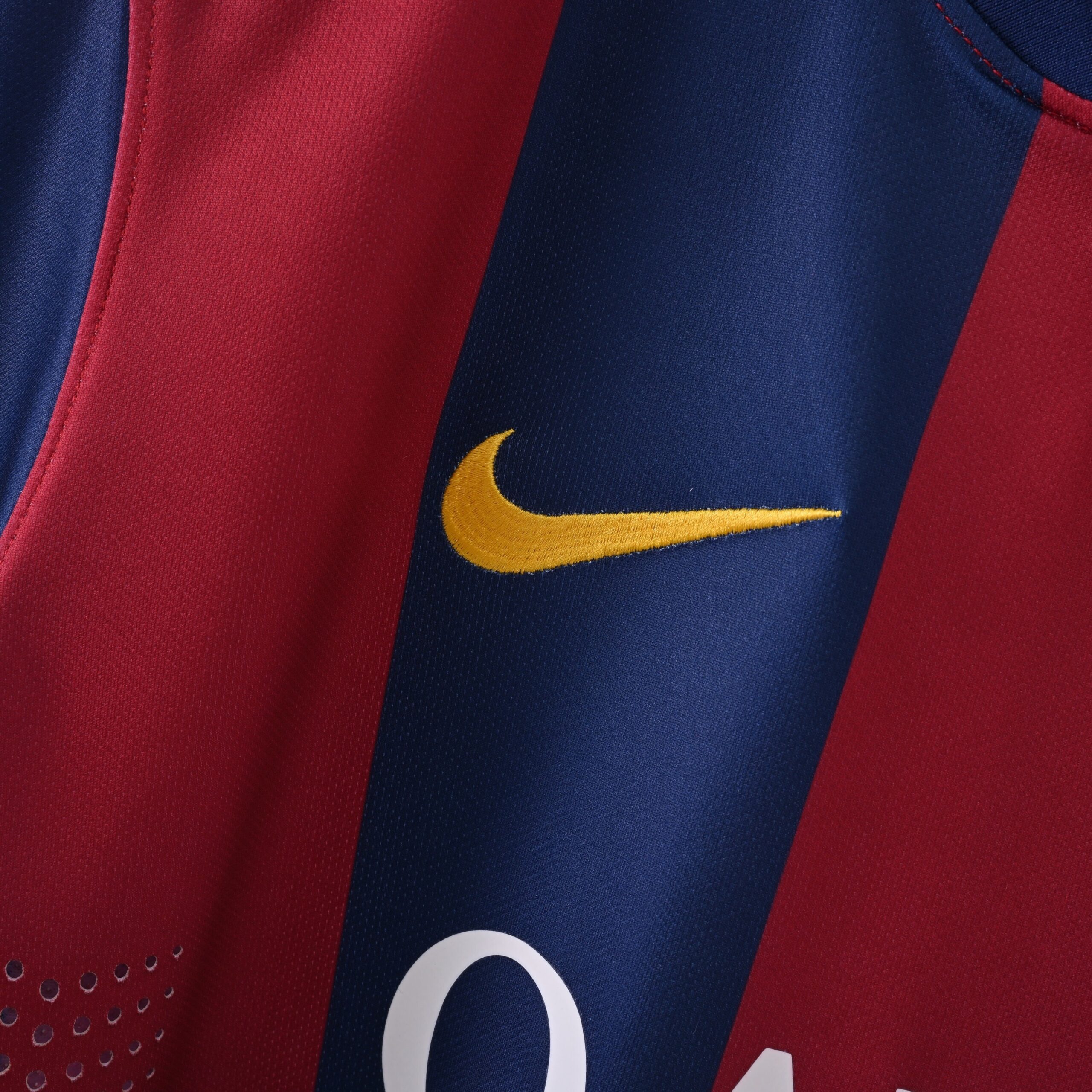 The 2014/15 home kit heralded a return to a bolder, more classic look with wider vertical Blaugrana stripes and darker tones of red and blue, marking a move back to a more traditional aesthetic after thinner stripes in previous years. A key feature of this design is the relaxed blue V-neck collar which incorporates a Catalan touch by showcasing the yellow and red stripes of the Senyera (Catalan flag) in the open v-neck—the first time the flag appeared on the front of the club’s shirt.