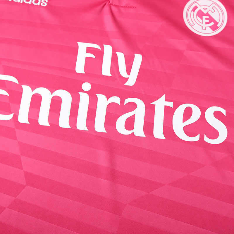 The 2014/15 Real Madrid away jersey takes a bold turn from tradition with a striking pink base colour, making it one of the most distinctive away kits in recent club history. The crest and sponsor logos are rendered in contrasting tones to keep visibility high, while a subtle star-pattern element on the front echoes the design language of the home shirt, tying the two kits together visually. The result is a modern, eye-catching away kit that stands out while maintaining club identity.