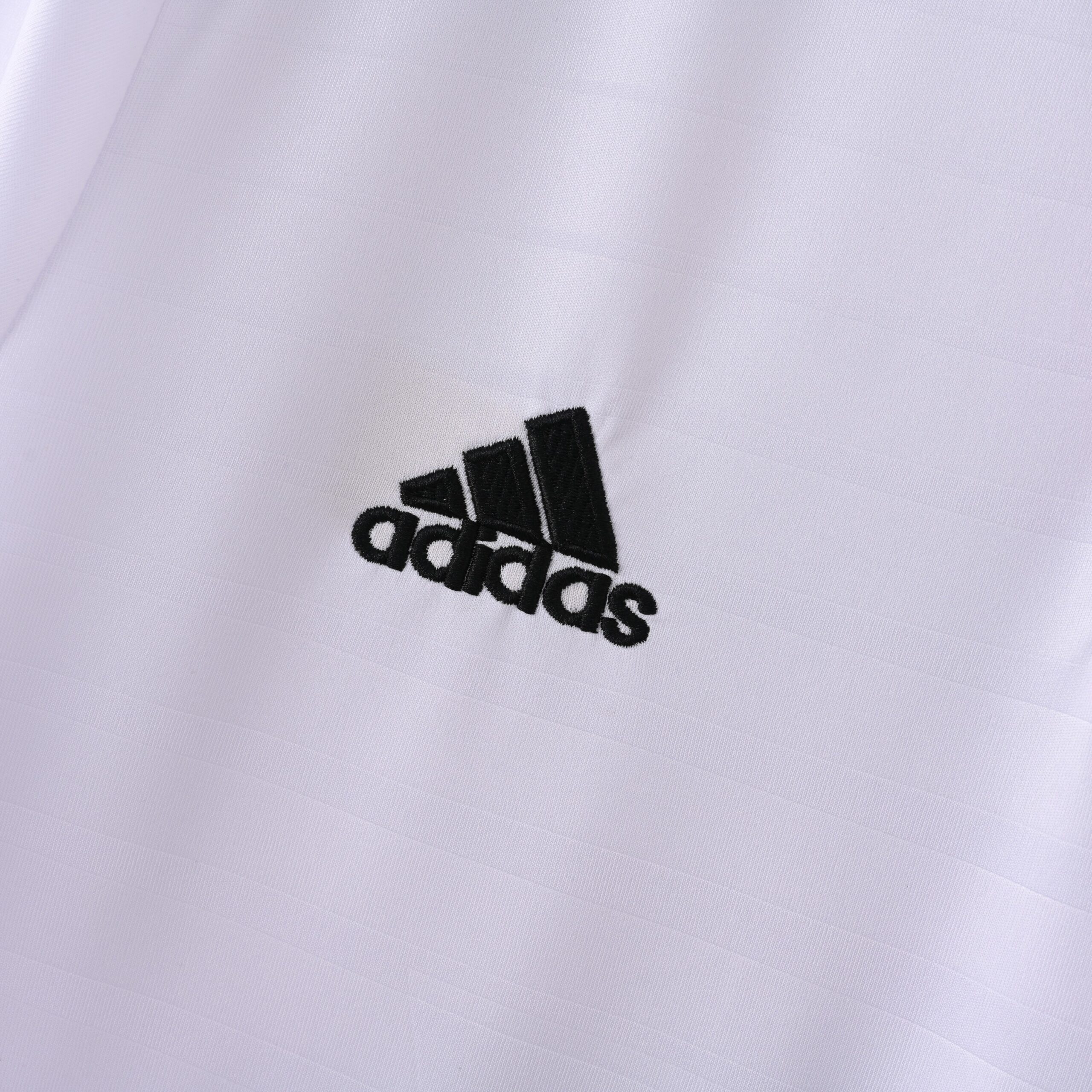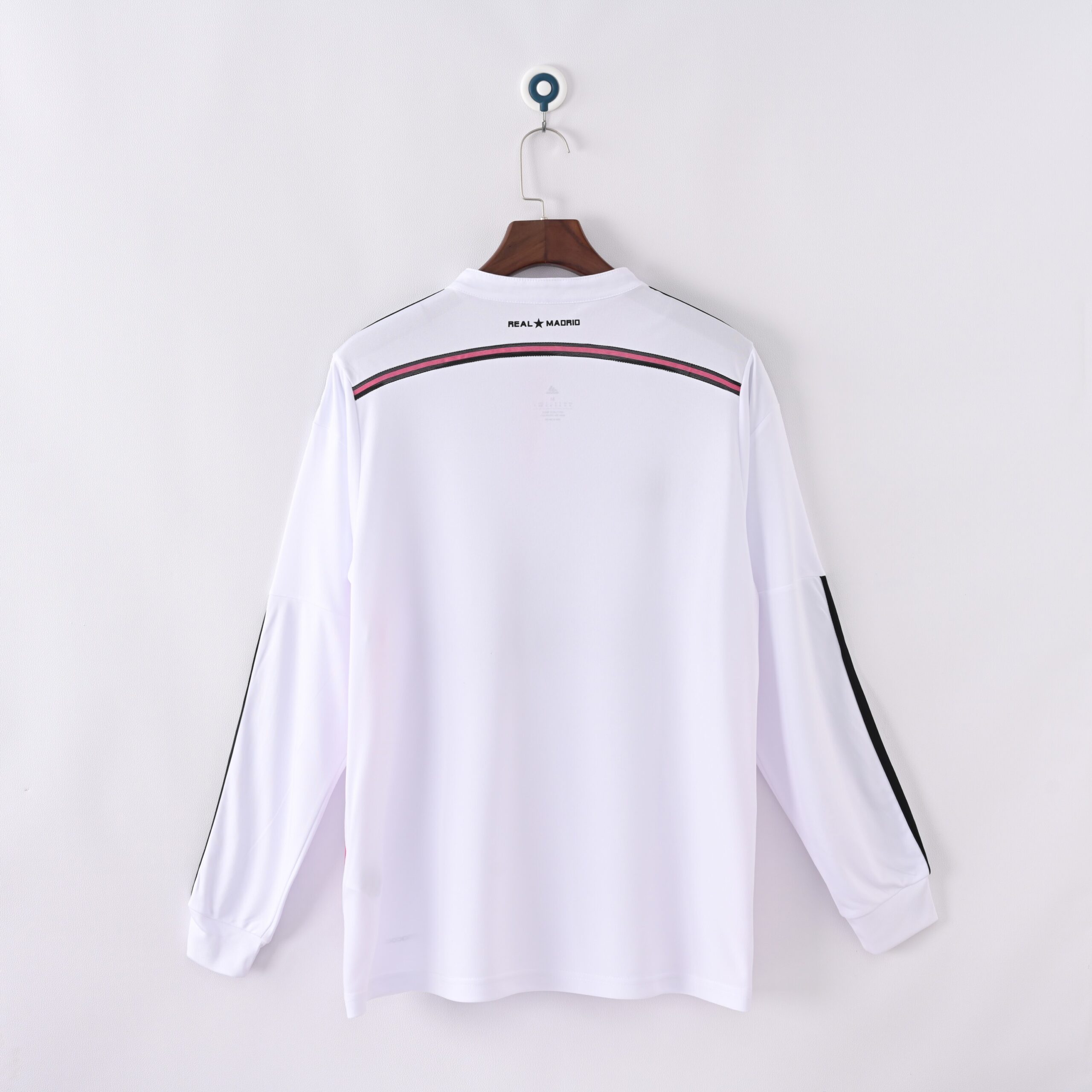 The 2014/15 Real Madrid home jersey blends the club’s iconic white tradition with subtle, stylish touches — it features a white base with thin black details and a slim pink horizontal line across the back and pink side-stripes, giving a modern edge while keeping the classic look mostly intact. The front of the shirt shows a subtle star-pattern graphic strip across the chest, adding a contemporary flair. The overall result is a clean, elegant shirt that honours Real Madrid heritage while giving a fresh 2015-era update.