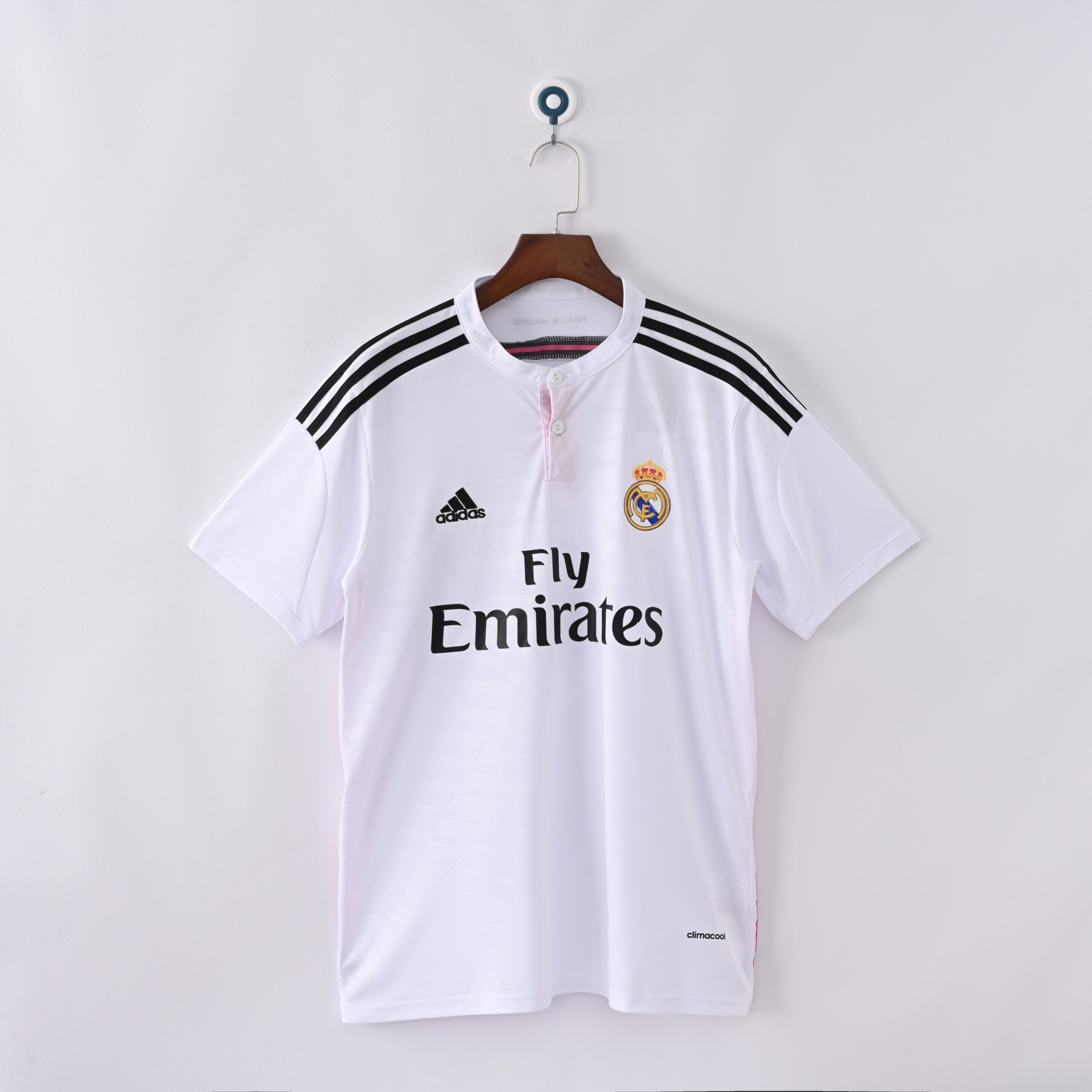 The 2014/15 Real Madrid home jersey blends the club’s iconic white tradition with subtle, stylish touches — it features a white base with thin black details and a slim pink horizontal line across the back and pink side-stripes, giving a modern edge while keeping the classic look mostly intact. The front of the shirt shows a subtle star-pattern graphic strip across the chest, adding a contemporary flair. The overall result is a clean, elegant shirt that honours Real Madrid heritage while giving a fresh 2015-era update.
