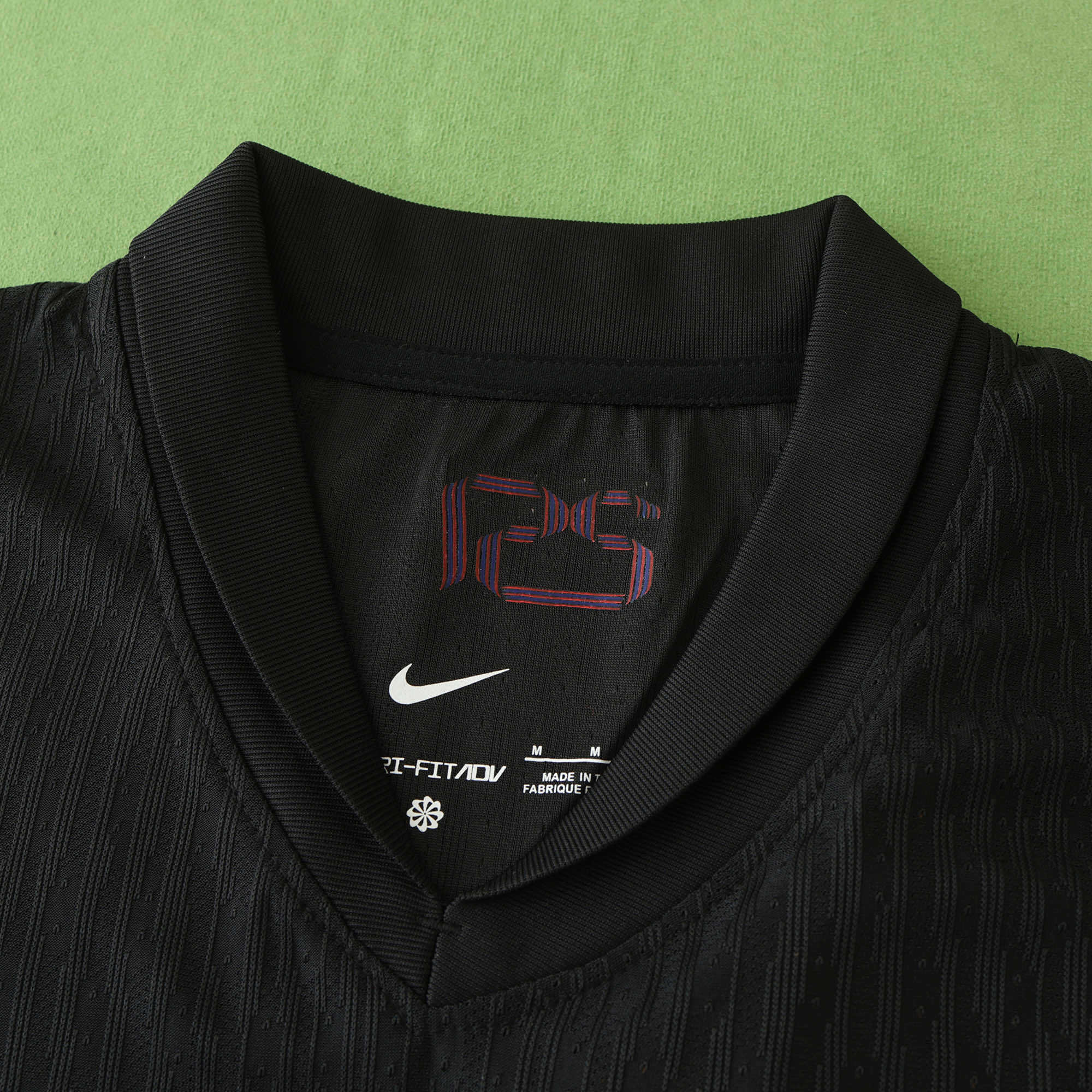 The 24/25 away jersey uses a sleek black base that remixes Barça’s iconic stripes in a modern way. The design includes subtle Blaugrana trim and a high-finish badge treatment, creating a futuristic aesthetic that works both on the pitch and off it.