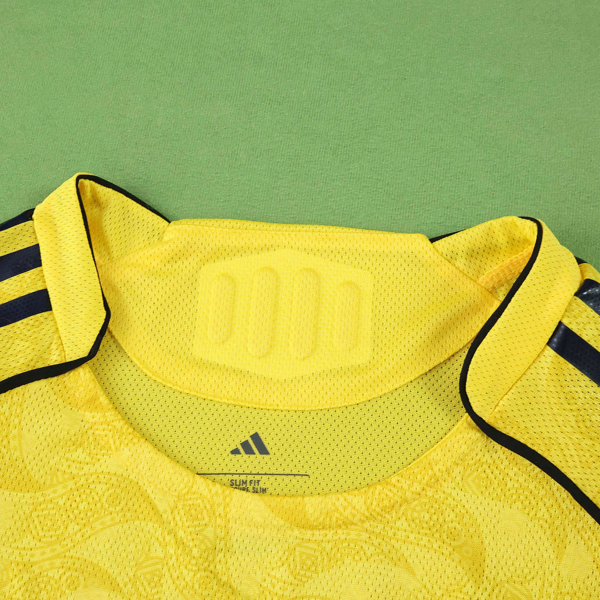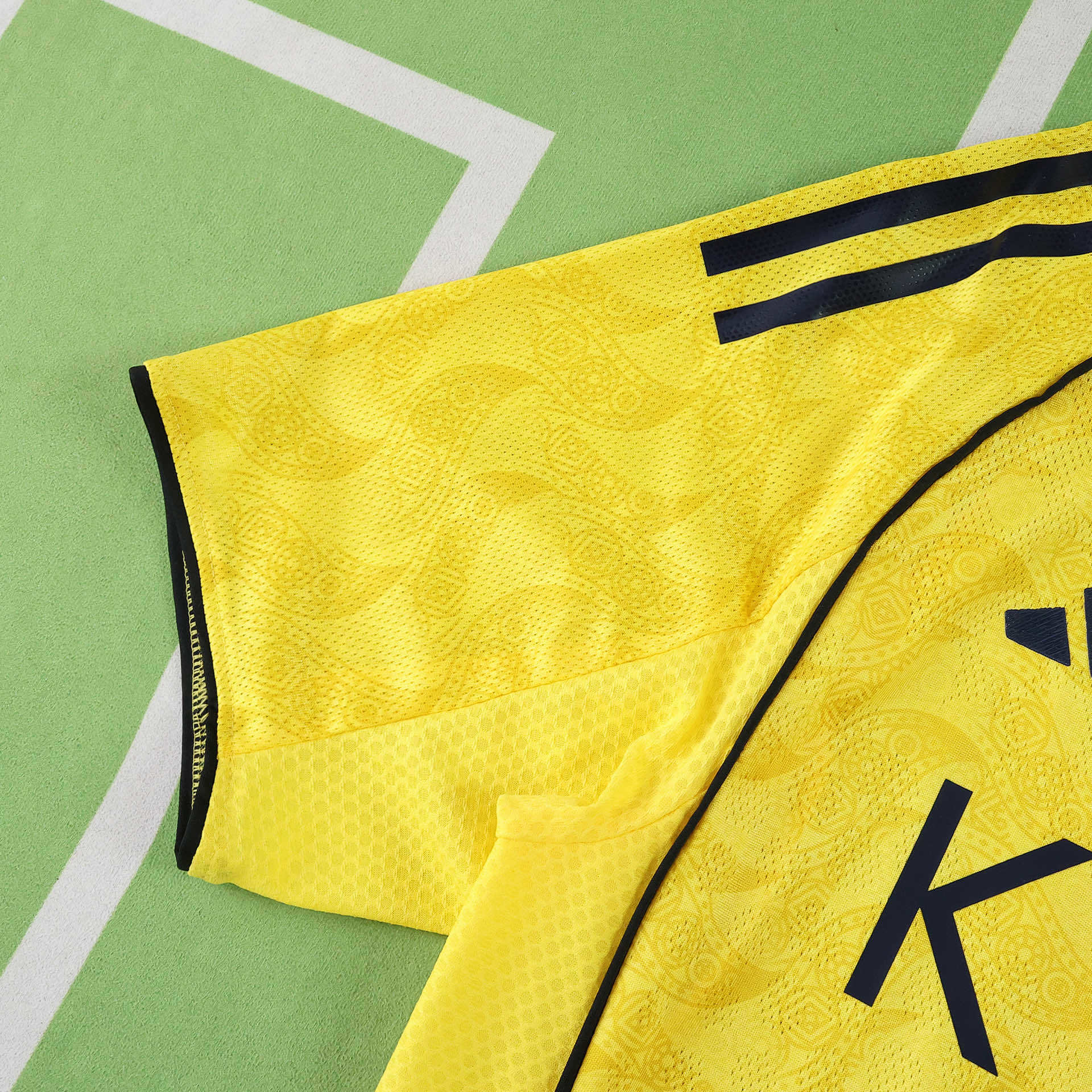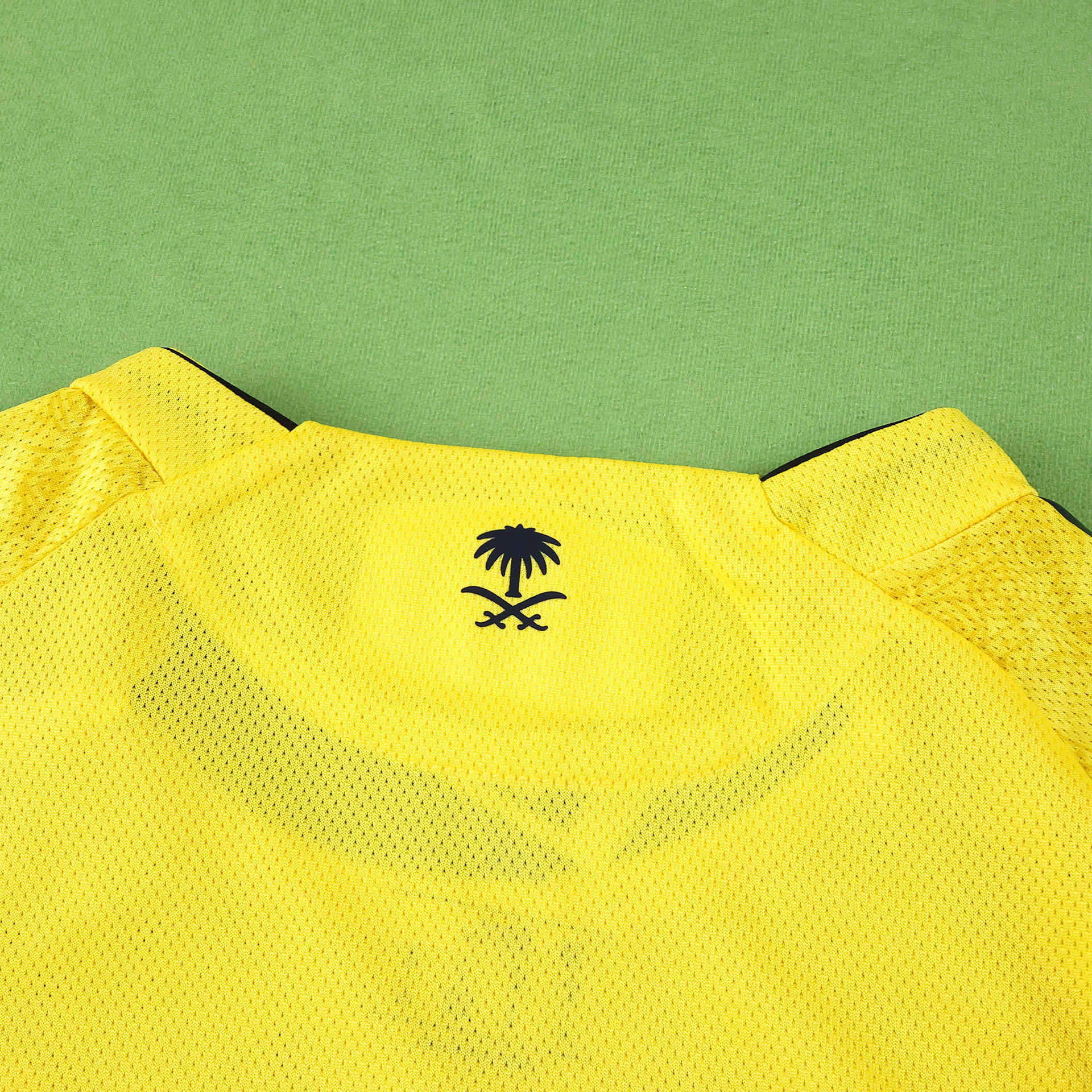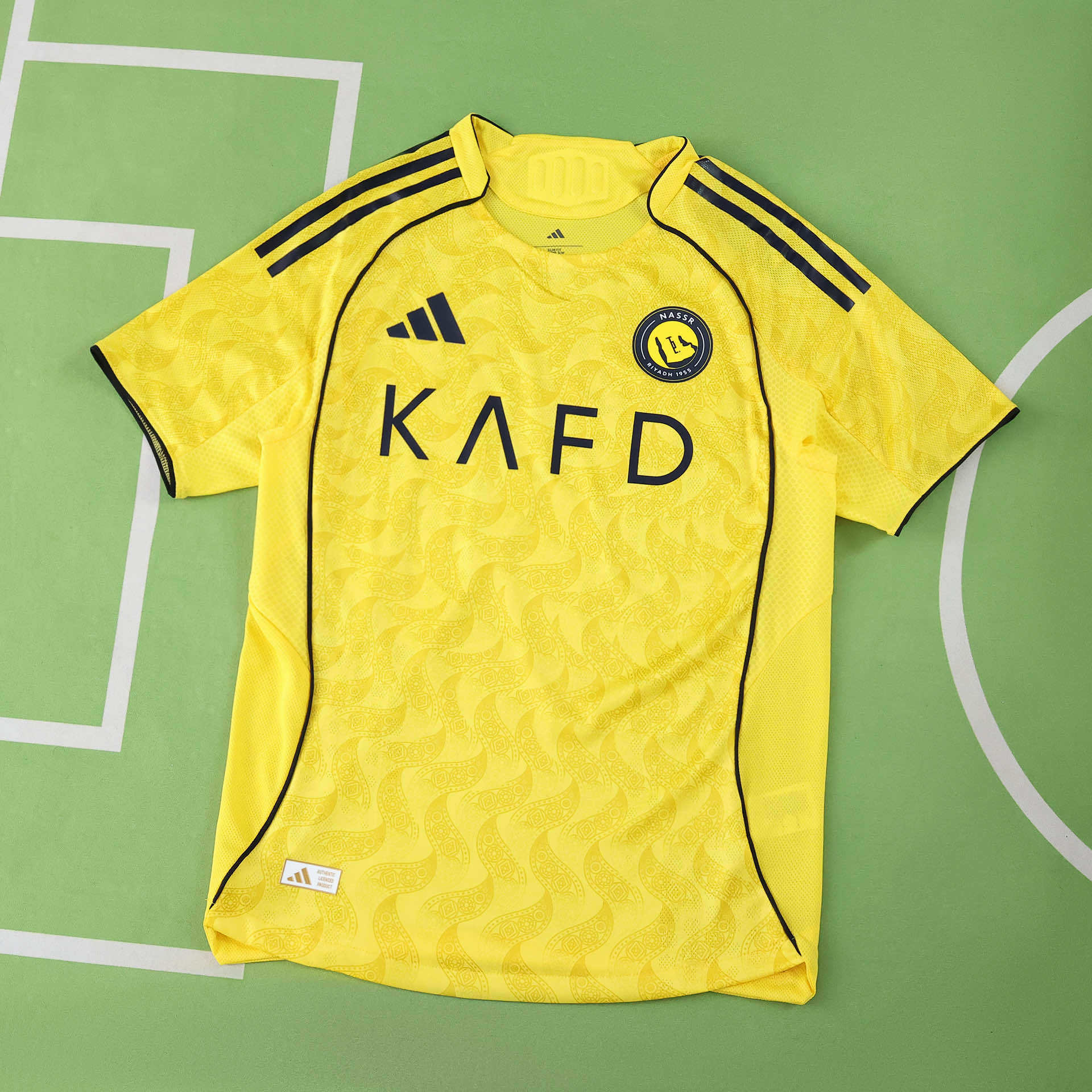 The Al Nassr 2025/26 home jersey is a striking tribute to Riyadh’s blazing sunshine and the club’s desert roots. It boasts a bright yellow base with a radiating wavy graphic that evokes both sun rays and rolling dunes, symbolizing Al Nassr’s “Knights” aura.