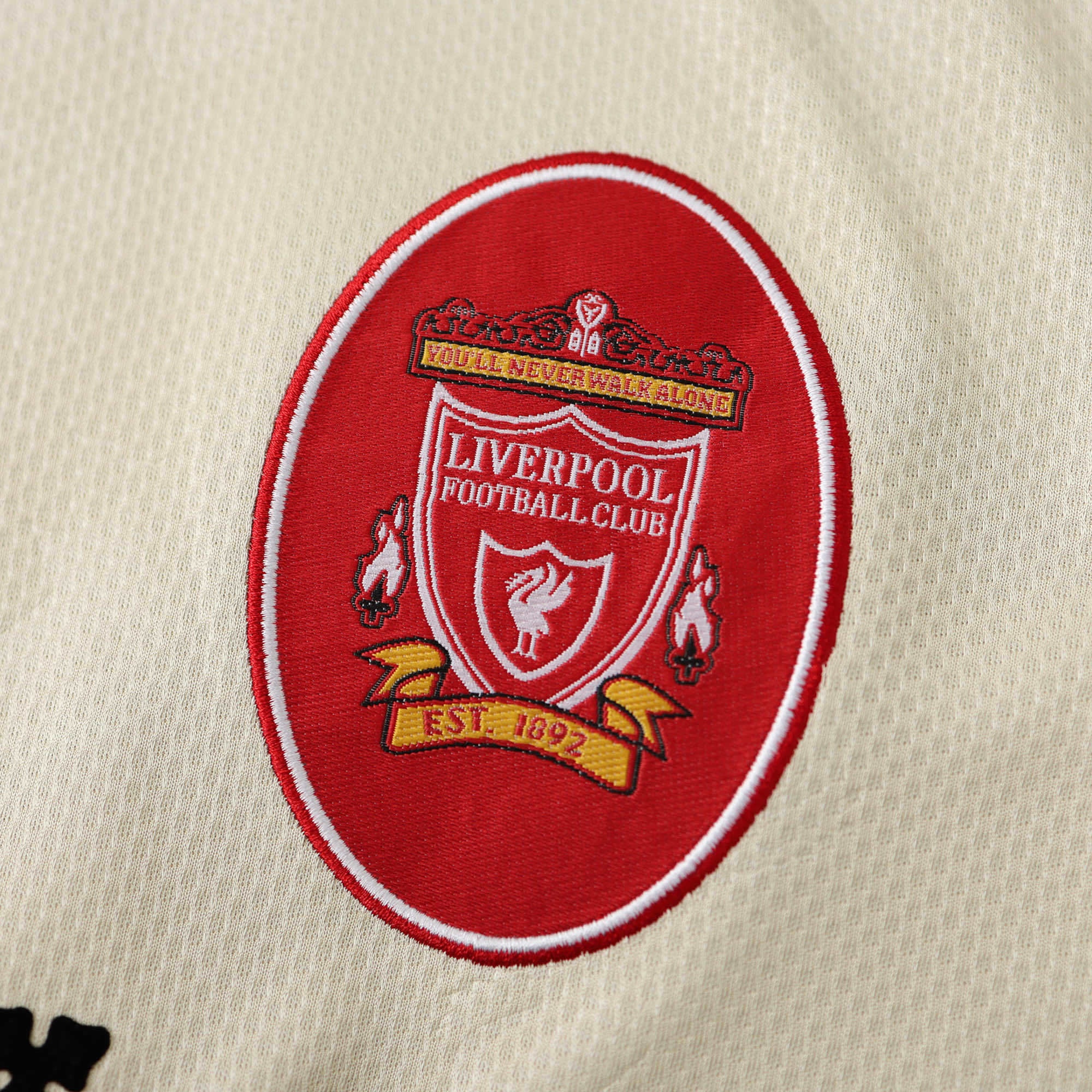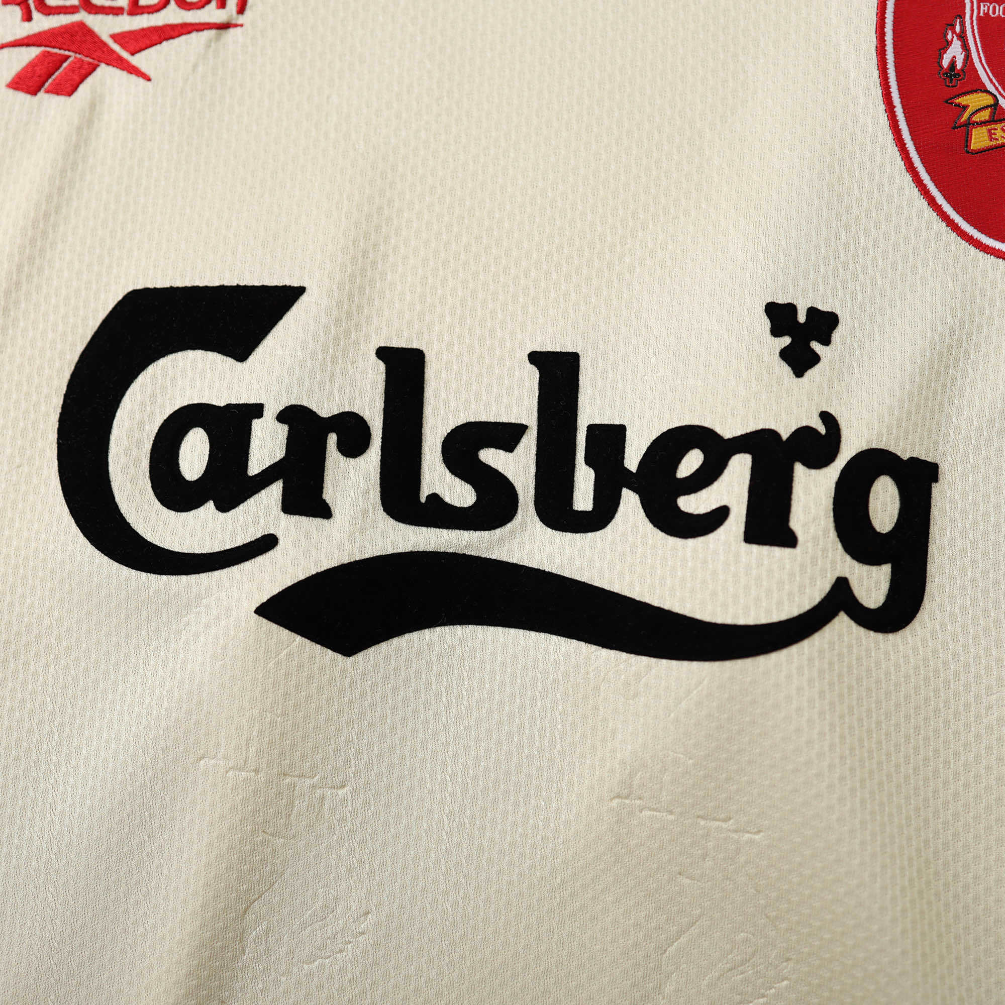The 1996/97 Liverpool away shirt is one of the more distinctive kits from the 90s, produced by Reebok. Its base colour is a soft cream / ecru, which gives it a retro-classic feel. A subtle Liverbird pattern is embossed into the fabric, adding texture and depth without overpowering the clean colourway. The trim – around the collar and sleeves – uses teal / dark green and red accents, tying into Liverpool’s traditional palette but in a fresh, understated way.