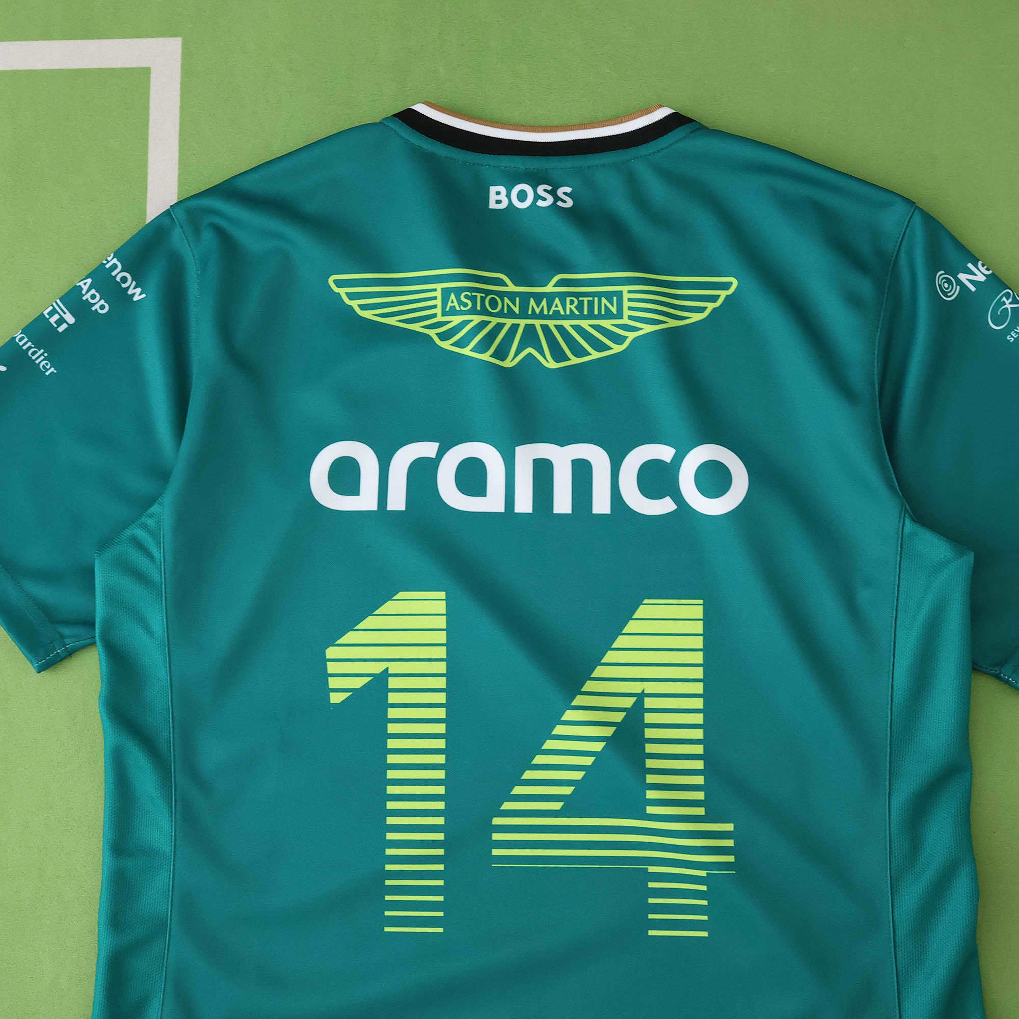 The official 2025 Fernando Alonso Replica Driver T-shirt, as worn by Fernando throughout the 2025 F1 season. Part of the official 2025 replica teamwear collection, Fernando’s Driver T-shirt features all the updated 2025 Aston Martin F1 Team and partner branding, Fernando’s signature print, alongside his driver number ’14’ on the rear.